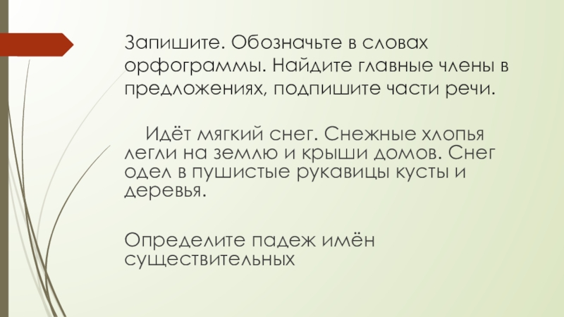 Идёт мягкий снег. Снежные хлопья легли на землю и крыши домов. Снег одел в пушистые рукавицы кусты и деревья.