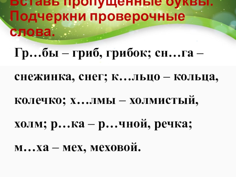 Вставь пропущенные буквы. Подчеркни проверочные слова.Гр…бы – гриб, грибок; сн…га – снежинка, снег; к…льцо – кольца, колечко;