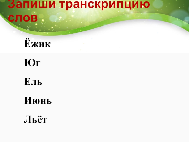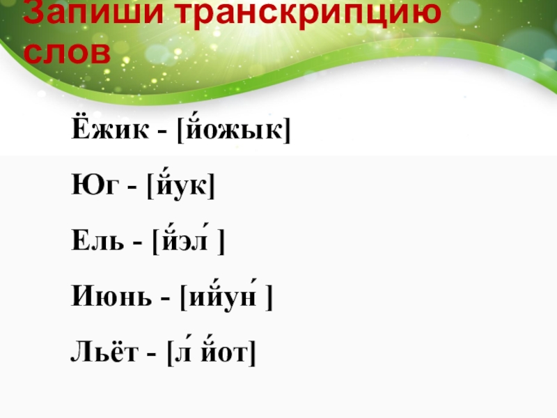 Запиши транскрипцию словЁжикЮгЕльИюньЛьёт