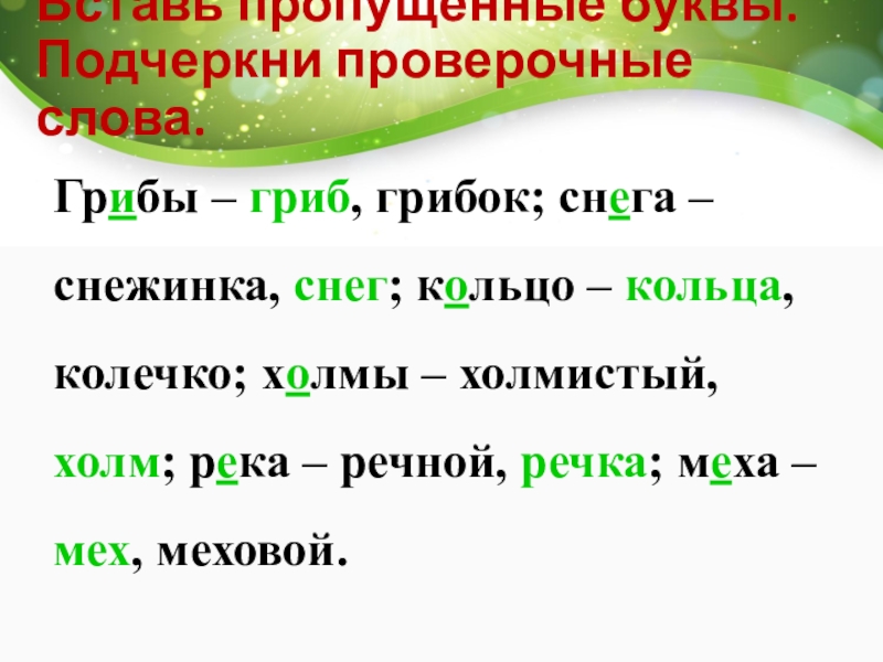Вставь пропущенные буквы. Подчеркни проверочные слова.Грибы – гриб, грибок; снега – снежинка, снег; кольцо – кольца, колечко;