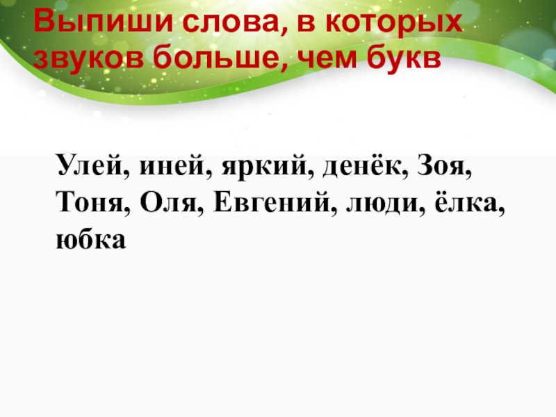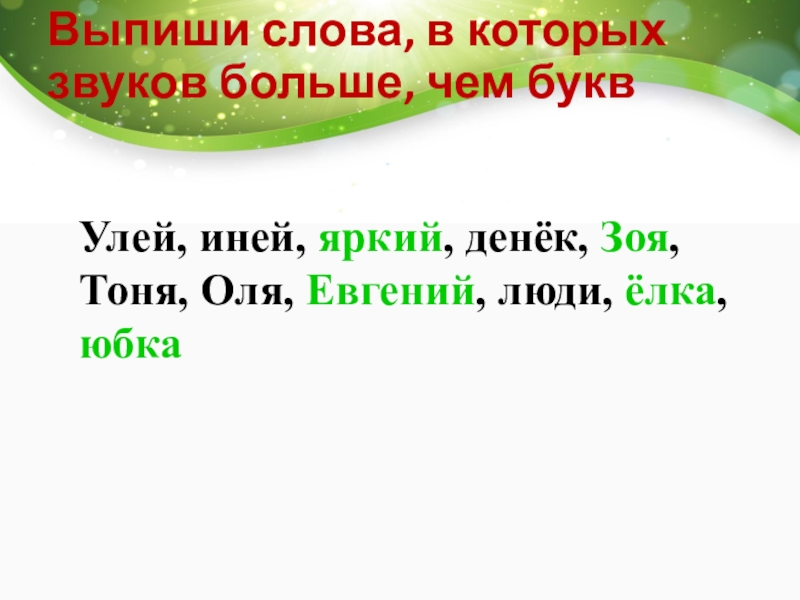Выпиши слова, в которых звуков больше, чем буквУлей, иней, яркий, денёк, Зоя, Тоня, Оля, Евгений, люди, ёлка, юбка