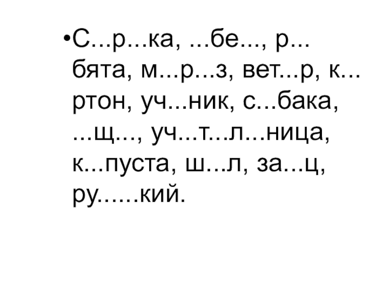 Слайд 7С...р...ка, ...бе..., р...бята, м...р...з, вет...р, к...ртон, уч...ник, с...бака, ...щ..., уч...т...л...ница, к...пуста,