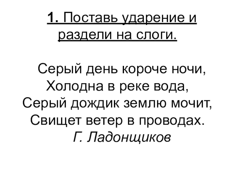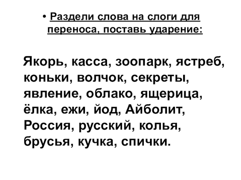 Слайд 11. Поставь ударение и раздели на слоги.
