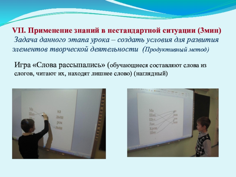 Игра «Слова рассыпались» (обучающиеся составляют слова из слогов, читают их, находят лишнее слово) (наглядный)