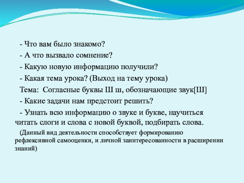 -Ребята! Вас приветствует солнышко, оно освещает лучами землю, а вы осветите наш класс своими знаниями, умением. Я желаю вам на уроке чтения успехов, а вы пожелайте друг другу удачи (хлопками передают друг другу пожелания).