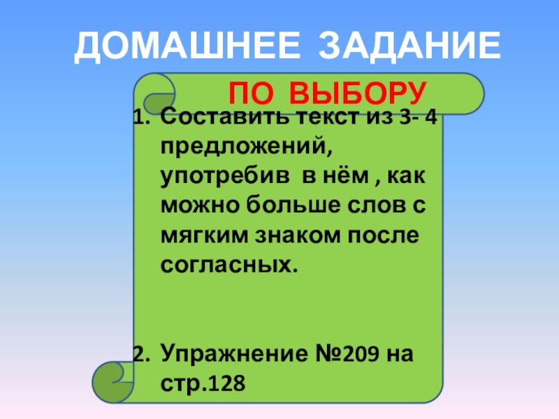 ДОМАШНЕЕ ЗАДАНИЕСоставить текст из 3- 4 предложений, употребив в нём , как можно больше слов с мягким