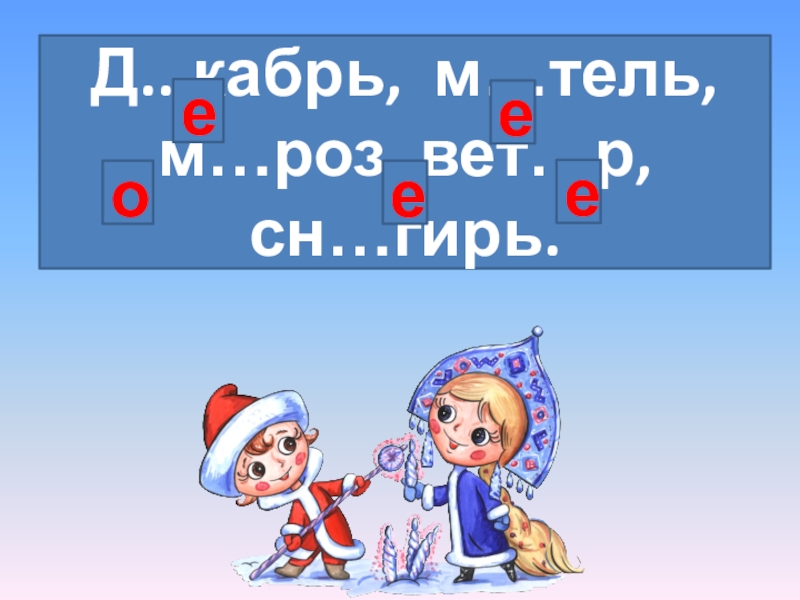 Слайд 7Д...кабрь, м…тель, м…роз, вет…р, сн…гирь.