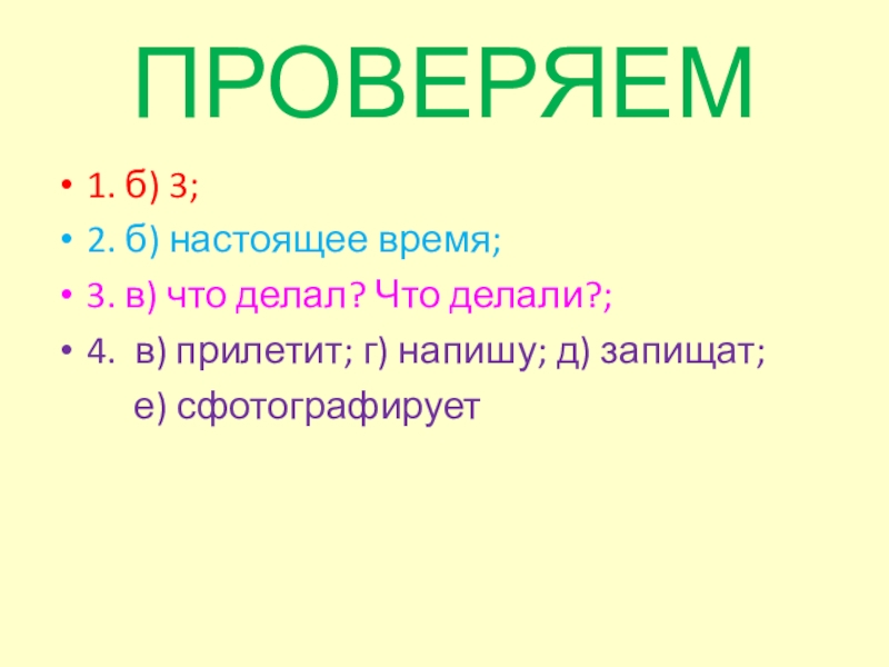 ПРОВЕРЯЕМ1. б) 3;2. б) настоящее время;3. в) что делал? Что делали?;4. в) прилетит; г) напишу; д) запищат;