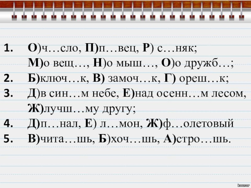 О)ч…сло, П)п…вец, Р) с…няк; М)о вещ…, Н)о мыш…, О)о дружб…;Б)ключ…к, В) замоч…к, Г) ореш…к;Д)в син…м небе, Е)над