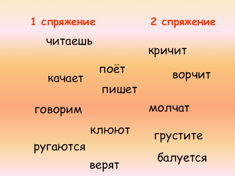 1 спряжение2 спряжениекачаетпишетклюютругаютсякричитмолчатчитаешьворчитбалуетсяговоримпоётгруститеверят