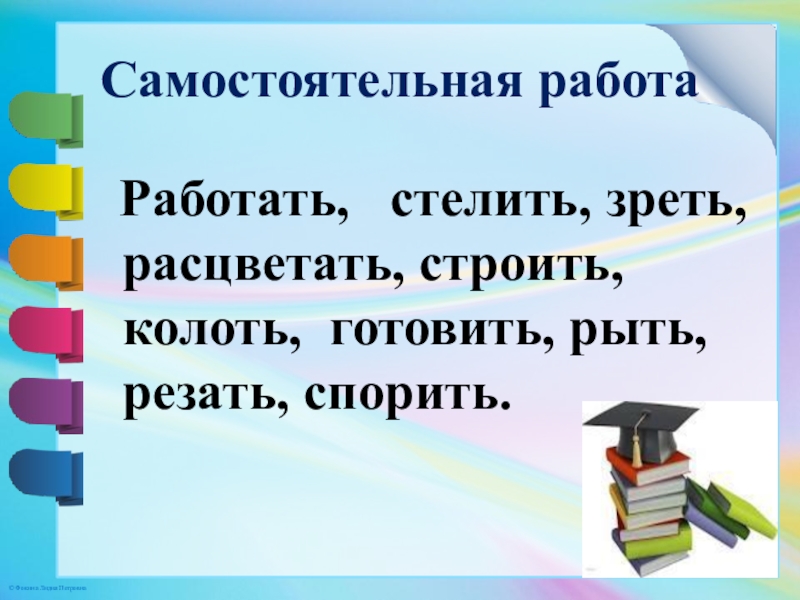 Самостоятельная работа  Работать,  стелить, зреть,  расцветать, строить,  колоть, готовить, рыть, резать, спорить.
