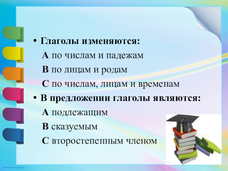 Глаголы изменяются:  А по числам и падежам  В по лицам и родам  С по
