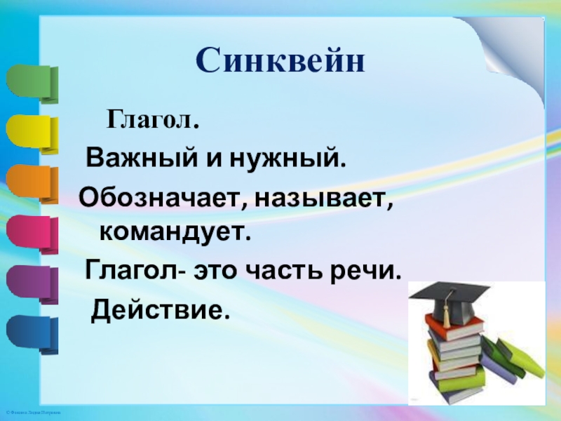 Синквейн  Глагол. Важный и нужный. Обозначает, называет, командует. Глагол- это часть речи.  Действие.