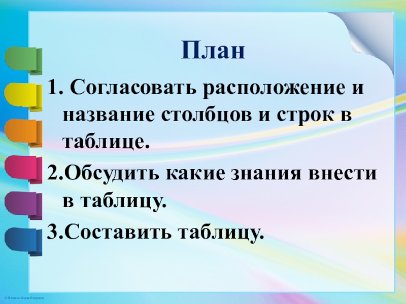План 1. Согласовать расположение и название столбцов и строк в таблице.2.Обсудить какие знания внести в таблицу.3.Составить таблицу.