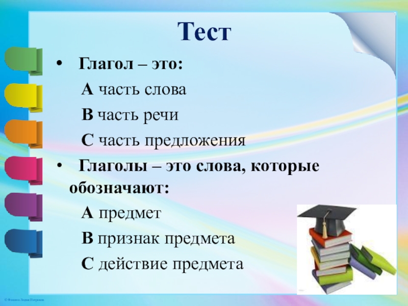 Тест Глагол – это:   А часть слова   В часть речи   С