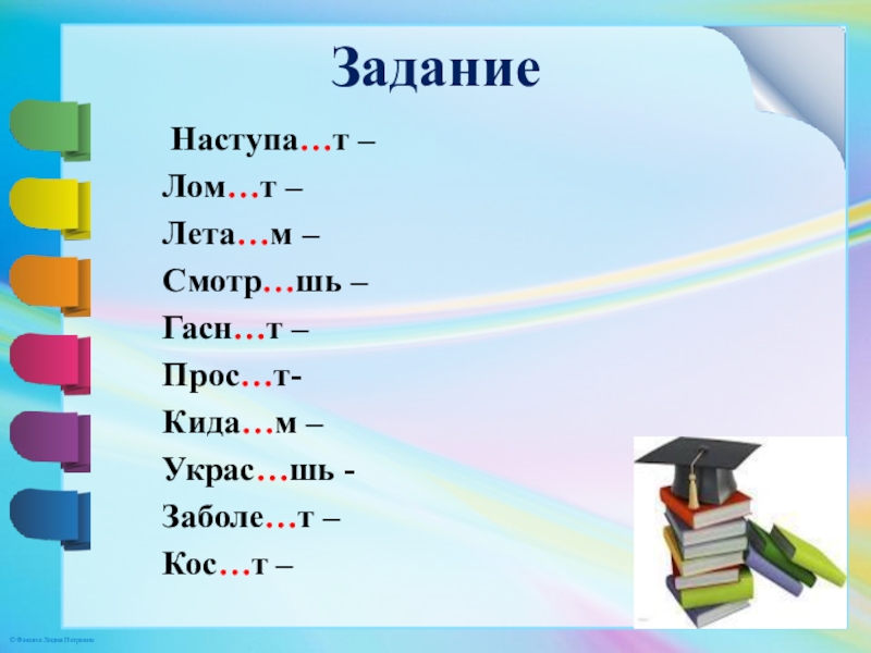 Задание Наступа…т – Лом…т – Лета…м – Смотр…шь – Гасн…т – Прос…т-Кида…м – Украс…шь -Заболе…т – Кос…т –