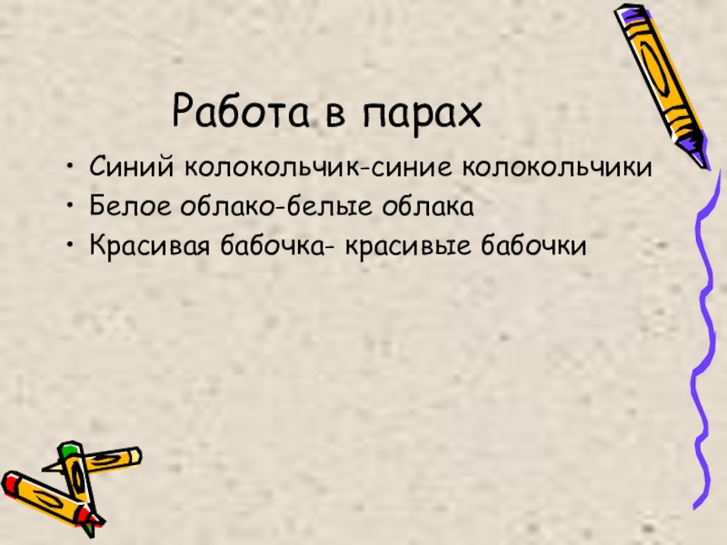 Работа в парахСиний колокольчик-синие колокольчикиБелое облако-белые облакаКрасивая бабочка- красивые бабочки