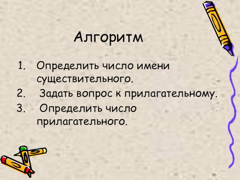 АлгоритмОпределить число имени существительного. Задать вопрос к прилагательному. Определить число прилагательного.