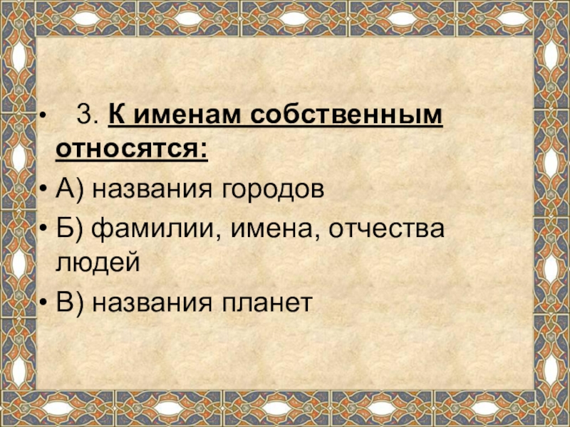 3. К именам собственным относятся:А) названия городовБ) фамилии, имена, отчества людейВ) названия планет