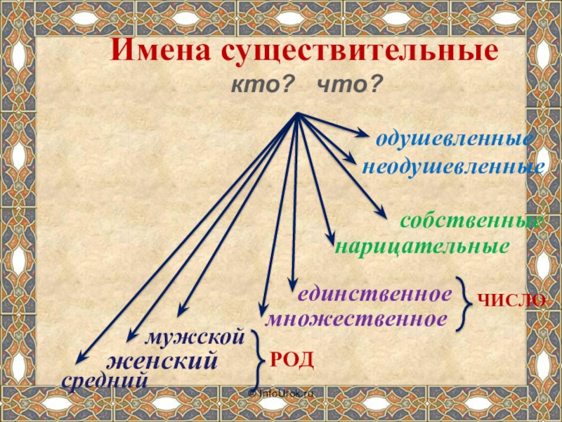 © InfoUrok.ruИмена существительныекто?  что?одушевленныенеодушевленныесобственныенарицательныеединственноемножественноеженскийсредниймужскойЧИСЛОРОД
