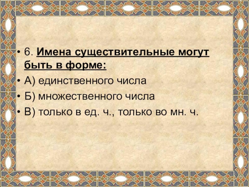 6. Имена существительные могут быть в форме:А) единственного числаБ) множественного числаВ) только в ед. ч., только во