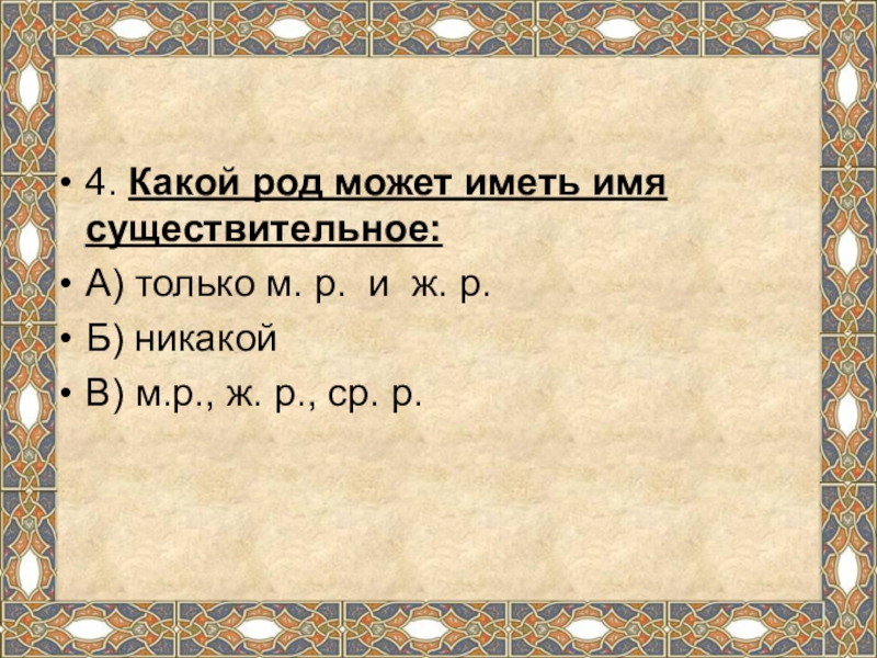 4. Какой род может иметь имя существительное:А) только м. р. и ж. р.Б) никакойВ) м.р., ж. р.,