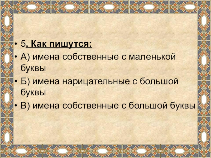 5. Как пишутся:А) имена собственные с маленькой буквыБ) имена нарицательные с большой буквыВ) имена собственные с большой