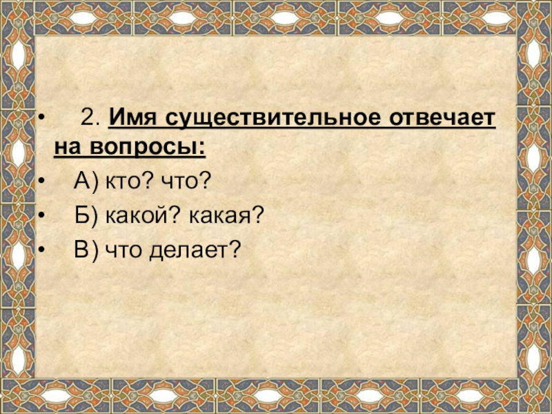 2. Имя существительное отвечает на вопросы:  А) кто? что?  Б) какой? какая?