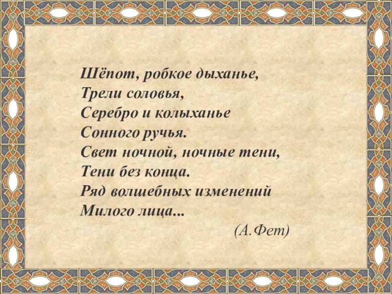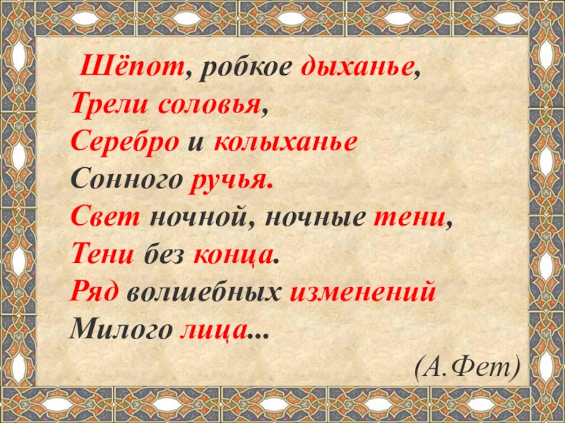 Слайд 5Шёпот, робкое дыханье,  Трели соловья,  Серебро и колыханье  Сонного ручья.  Свет ночной, ночные тени,  Тени без