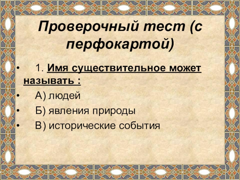 Проверочный тест (с перфокартой)  1. Имя существительное может  называть :  А) людей  Б)