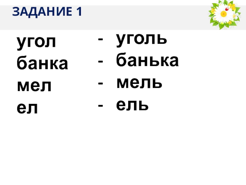 ЗАДАНИЕ 1уголбанкамелел- уголь- банька- мель- ель