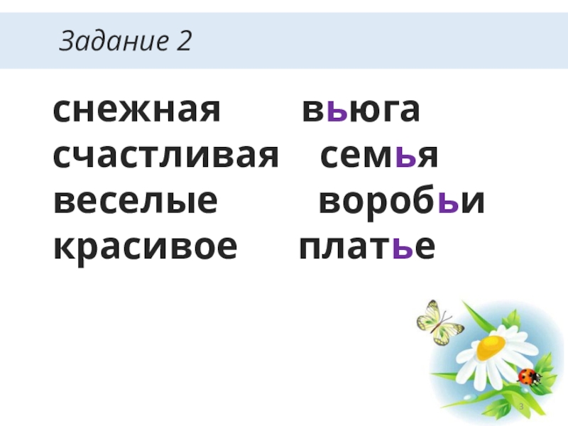 Задание 2снежная    вьюгасчастливая  семьявеселые     воробьикрасивое   платье