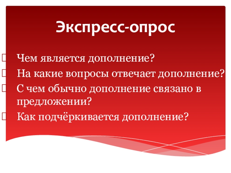 Экспресс-опросЧем является дополнение?На какие вопросы отвечает дополнение?С чем обычно дополнение связано в предложении? Как подчёркивается дополнение?