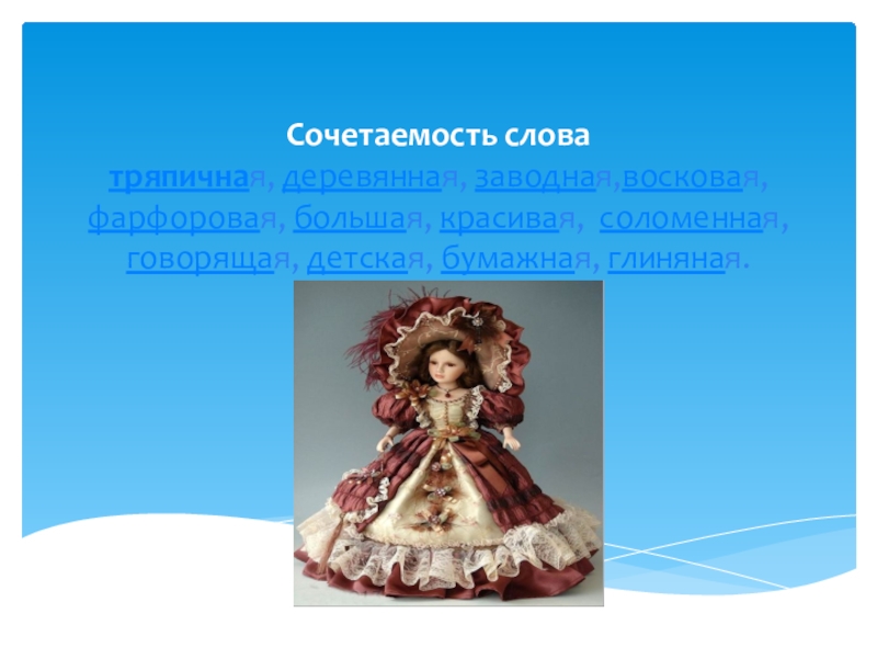 Слайд 7Сочетаемость слова тряпичная, деревянная, заводная,восковая, фарфоровая, большая, красивая, соломенная, говорящая, детская, бумажная,