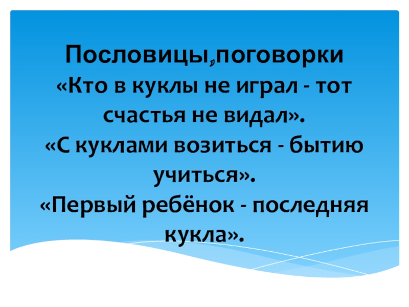 Пословицы,поговорки «Кто в куклы не играл - тот счастья не видал».  «С куклами возиться - бытию учиться».