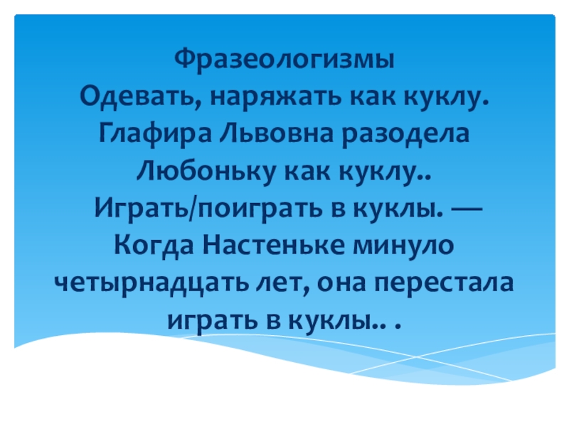 Слайд 6Фразеологизмы Одевать, наряжать как куклу. Глафира Львовна разодела Любоньку как куклу.. Играть/поиграть