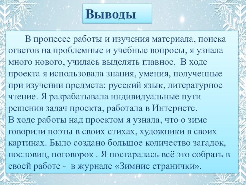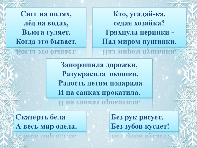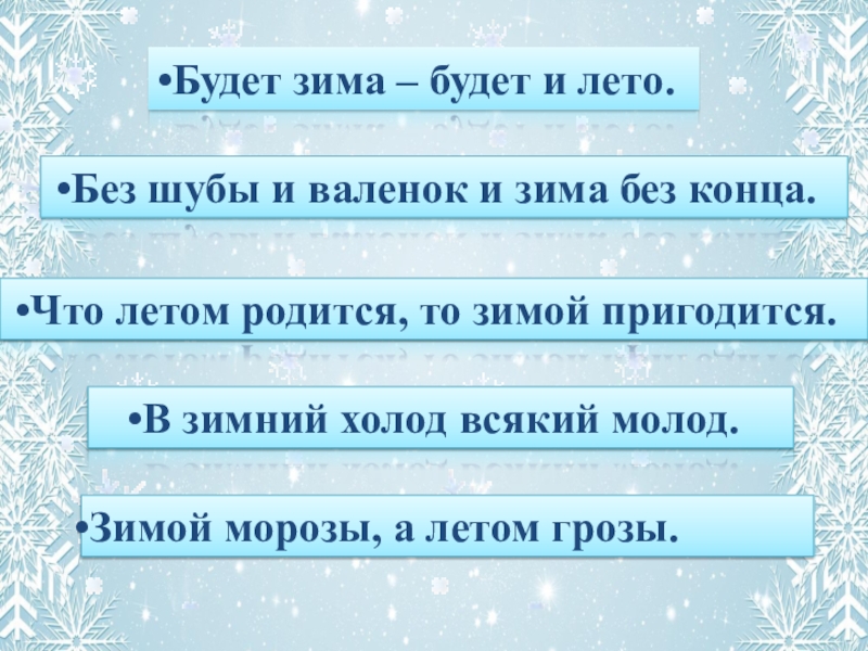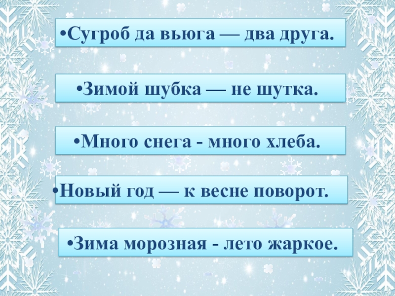 поработать над темой зимы в русском фольклоре, подобрать пословицы и загадки;