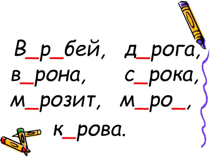 В_р_бей,  д_рога, в_рона,   с_рока, м_розит,  м_ро_,     к_рова.