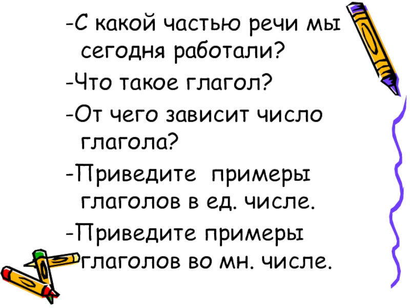 -С какой частью речи мы сегодня работали?-Что такое глагол? -От чего зависит число глагола?-Приведите примеры глаголов в