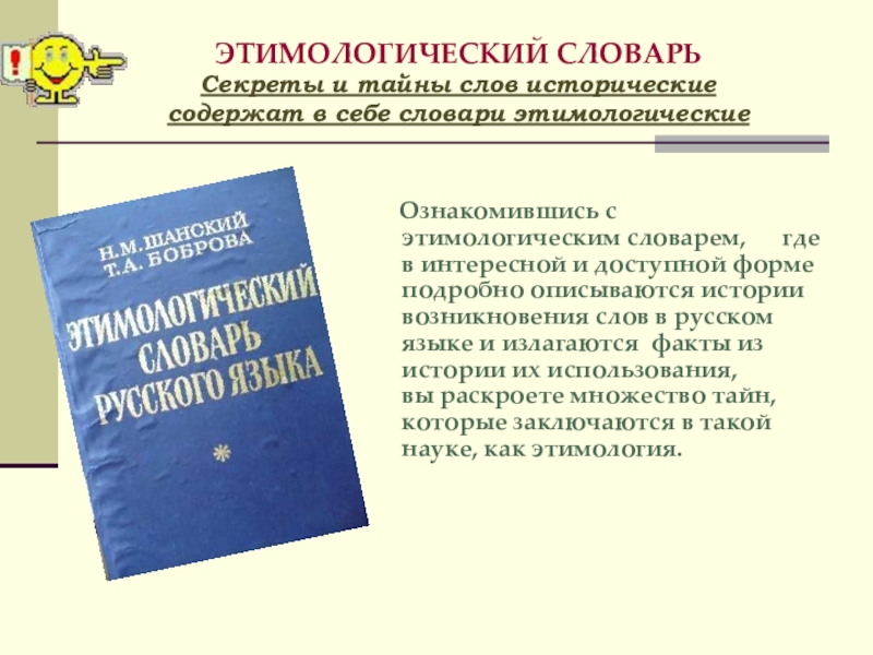 Ознакомившись с этимологическим словарем, где в интересной и доступной форме подробно описываются истории возникновения слов в русском языке и излагаются факты из истории их использования, вы раскроете множество тайн, которые заключаются в такой науке, как этимология.