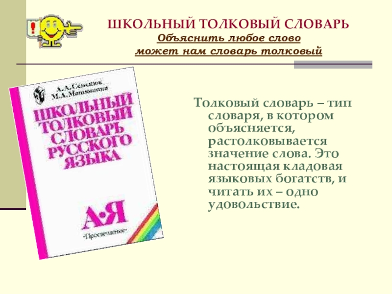 – тип словаря, в котором объясняется, растолковывается значение слова. Это настоящая кладовая языковых богатств, и читать их – одно удовольствие.