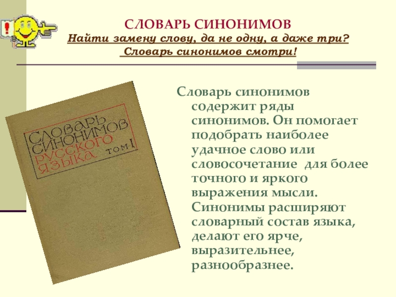 Словарь синонимов содержит ряды синонимов. Он помогает подобрать наиболее удачное слово или словосочетание для более точного и яркого выражения мысли. Синонимы расширяют словарный состав языка, делают его ярче, выразительнее, разнообразнее.
