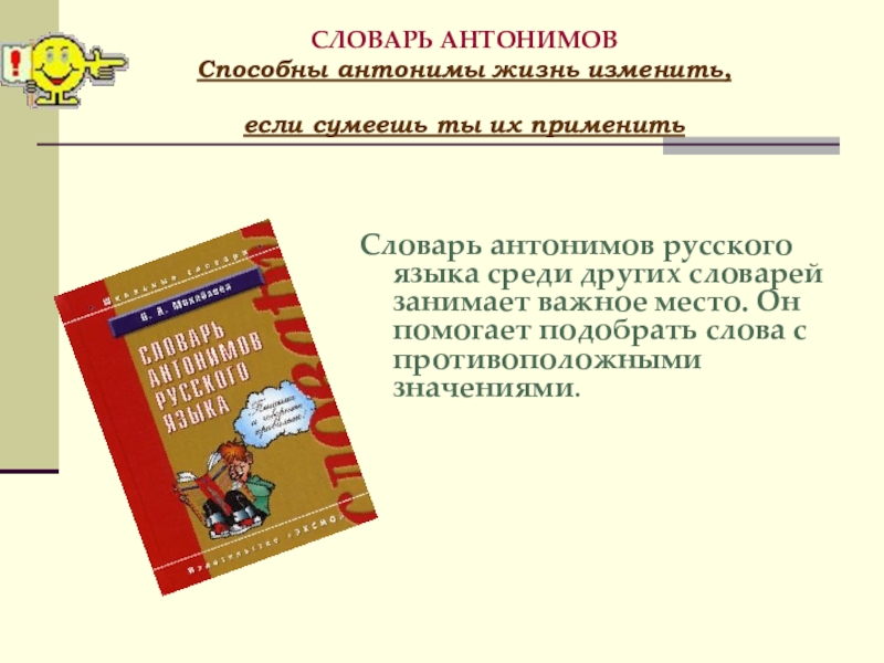 Словарь антонимов русского языка среди других словарей занимает важное место. Он помогает подобрать слова с противоположными значениями.