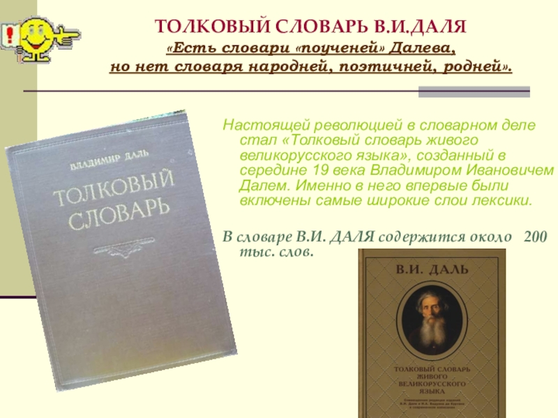 Настоящей революцией в словарном деле стал «Толковый словарь живого великорусского языка», созданный в середине 19 века Владимиром Ивановичем Далем. Именно в него впервые были включены самые широкие слои лексики.