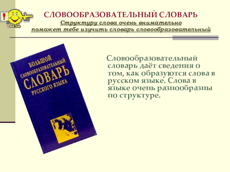 Словообразовательный словарь даёт сведения о том, как образуются слова в русском языке. Слова в языке очень разнообразны по структуре.