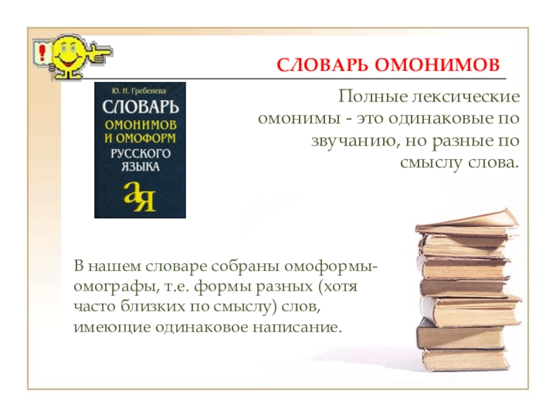 В нашем словаре собраны омоформы-омографы, т.е. формы разных (хотя часто близких по смыслу) слов, имеющие одинаковое написание.
