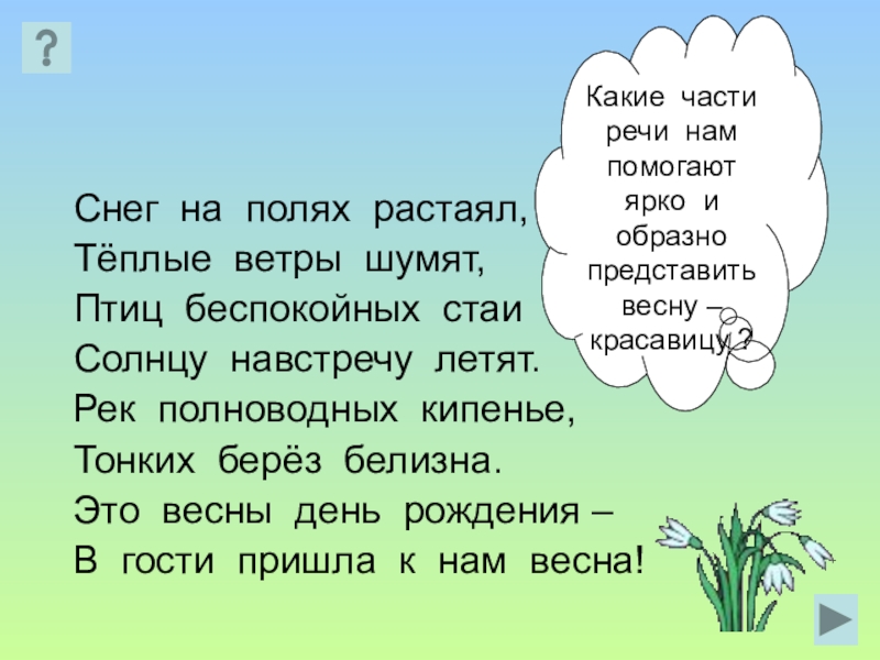 Какие части речи нам помогают ярко и образно представить весну – красавицу ?