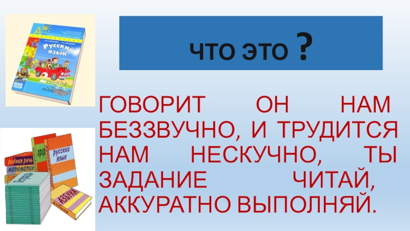 ЧТО ЭТО ?ГОВОРИТ ОН НАМ БЕЗЗВУЧНО, И ТРУДИТСЯ НАМ НЕСКУЧНО, ТЫ ЗАДАНИЕ ЧИТАЙ, АККУРАТНО ВЫПОЛНЯЙ.