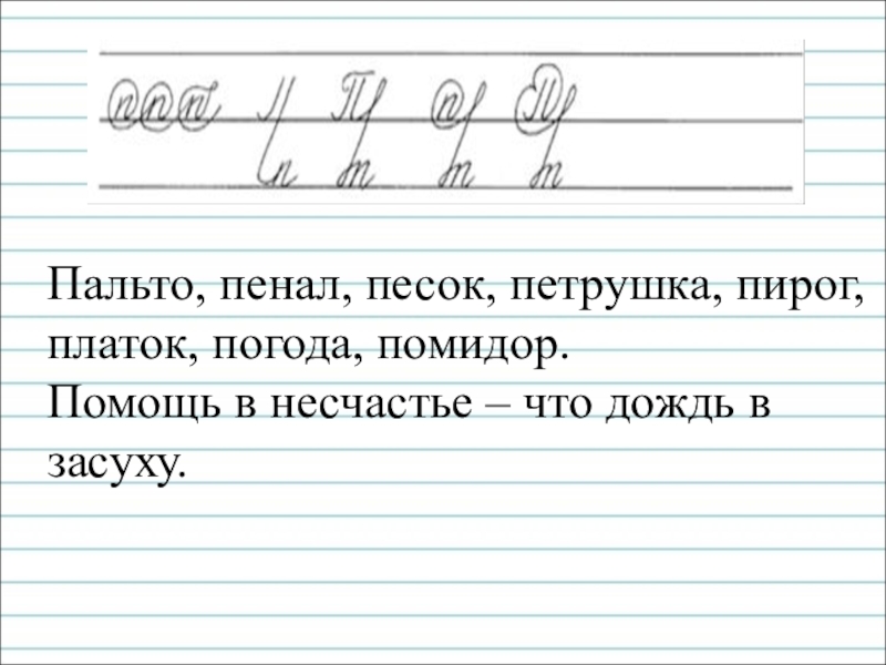 ЧистописаниеПальто, пенал, песок, петрушка, пирог, платок, погода, помидор.Помощь в несчастье – что дождь в засуху.