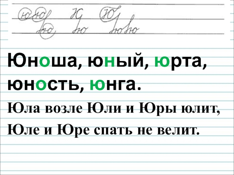 ЧистописаниеЮноша, юный, юрта, юность, юнга.Юла возле Юли и Юры юлит,Юле и Юре спать не велит.